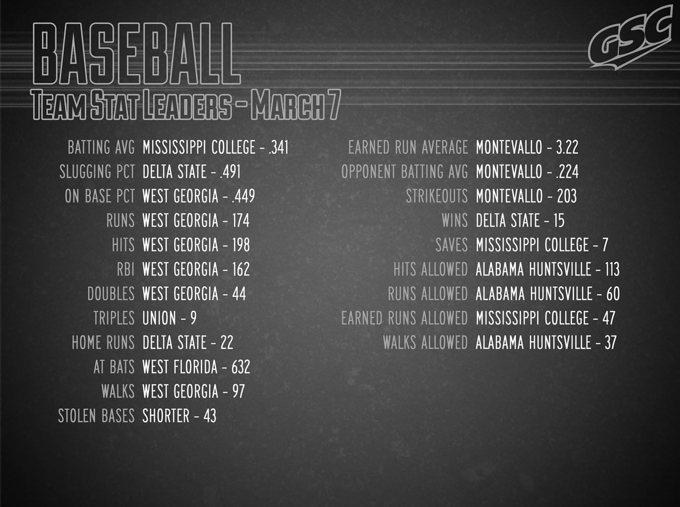 Gsc Baseball Stat Leaders As Of March 7 Gulf South Conference